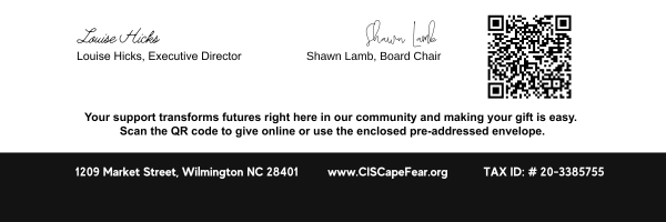 Thousands of young lives depend on us, and we depend on you. Your gift makes our work possible. Please help us continue this life changing work in the face of uncertain funding. Together, we can ensure every student has the opportunity to be present and be successful in life. From all of us at Communities In Schools of Cape Fear, thank you for your generosity and warmest wishes for a joyful holiday season.